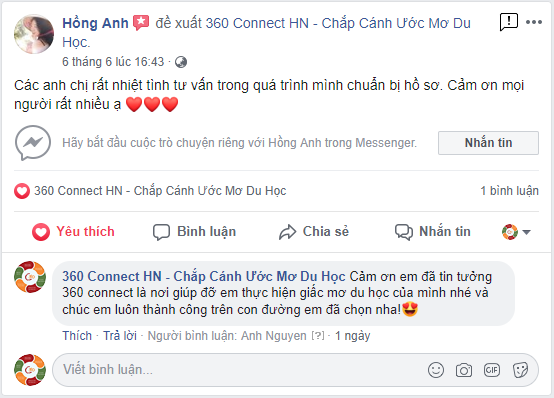 Cảm ơn Hồng Anh đã mang lại những cung bậc cảm xúc “thăng” “giáng” cho team 360 Connect. Câu chuyện về bạn chúng tôi sẽ lưu giữ mãi, là động lực cho team 360 Connect tiếp tục chắp cánh ước mơ du học cho các bạn sinh viên Việt Nam.